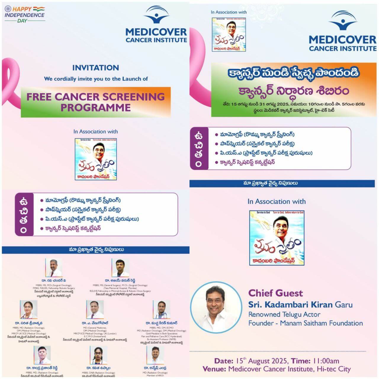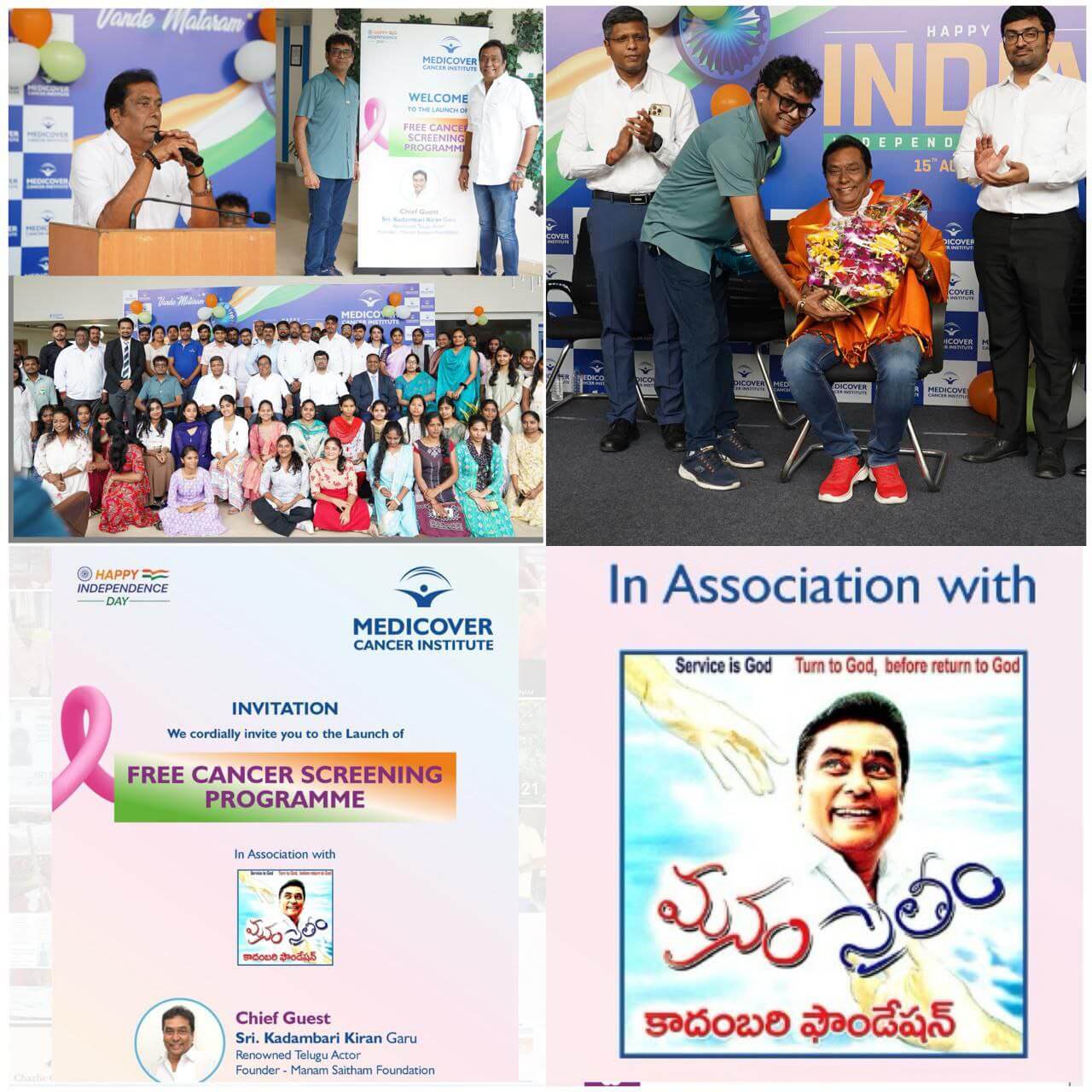 స్త్రీ ఆరోగ్యమే సమాజ సౌభాగ్యం! ప్రాణాలు కాపాడే డాక్టర్లు,వారి సిబ్బంది..దేవుళ్ళే ! స్వాతంత్ర్య దినోత్సవ సందర్భంగా *స్త్రీలు కాన్సర్ బారినపడకుండా కాపాడే ప్రయత్నంలో *మనం సైతం కాదంబరి ఫౌండేషన్* తోడుగా *మెడికవర్* ఆసుపత్రి వారు ఆరంభించిన అద్భుత *ఫ్రీ కాన్సర్ స్క్రీనింగ్ ప్రోగ్రాం* కి ముఖ్య అతిధిగా పాల్గొనటం నా అదృష్టం.